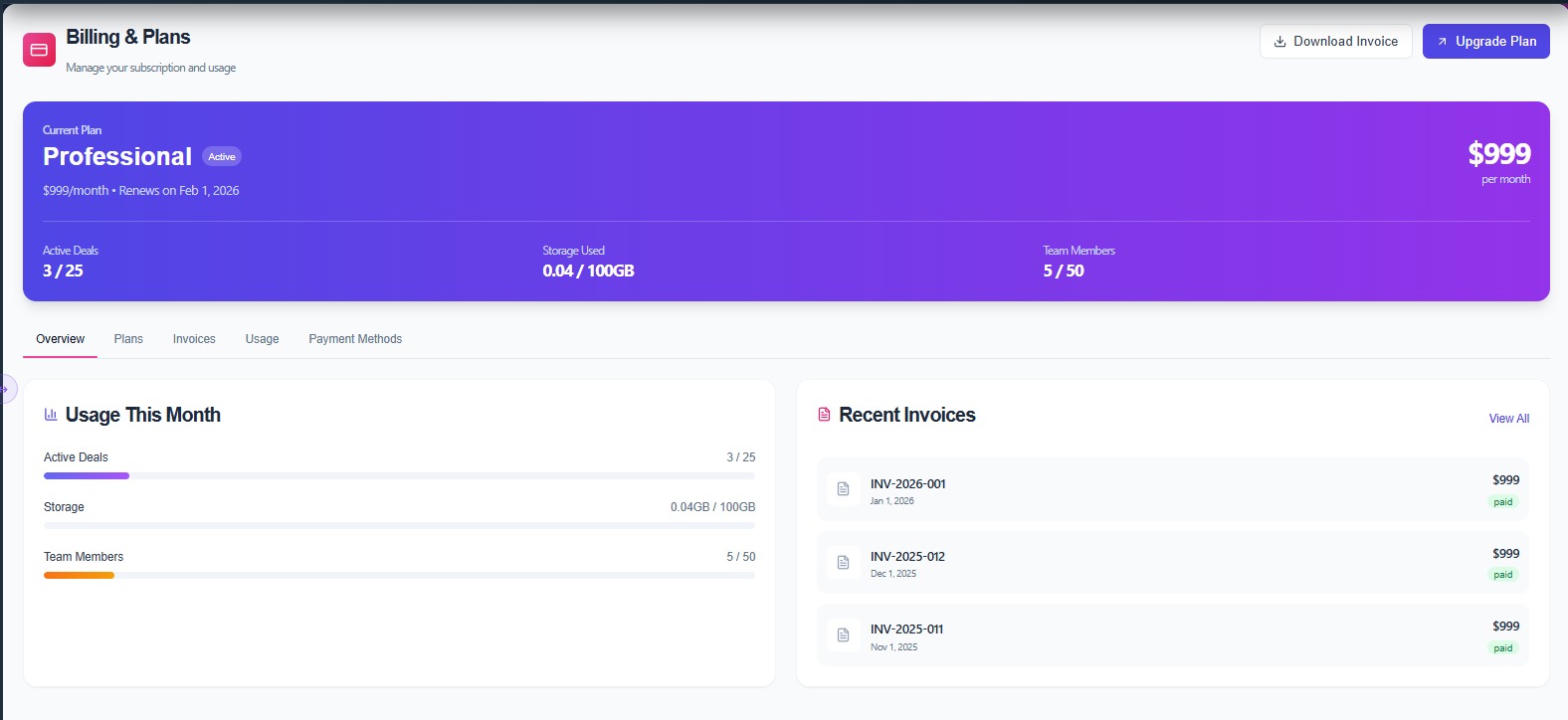 Monitor what you use, manage how you pay, and scale your plan as your deal volume grows — all from a single, transparent billing interface.