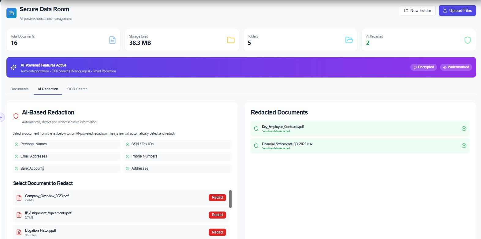 The Secure Data Room provides a centralized environment for storing, organizing, and managing transaction documents. It enables secure document sharing while supporting AI-powered tools to improve document management and protect sensitive information.