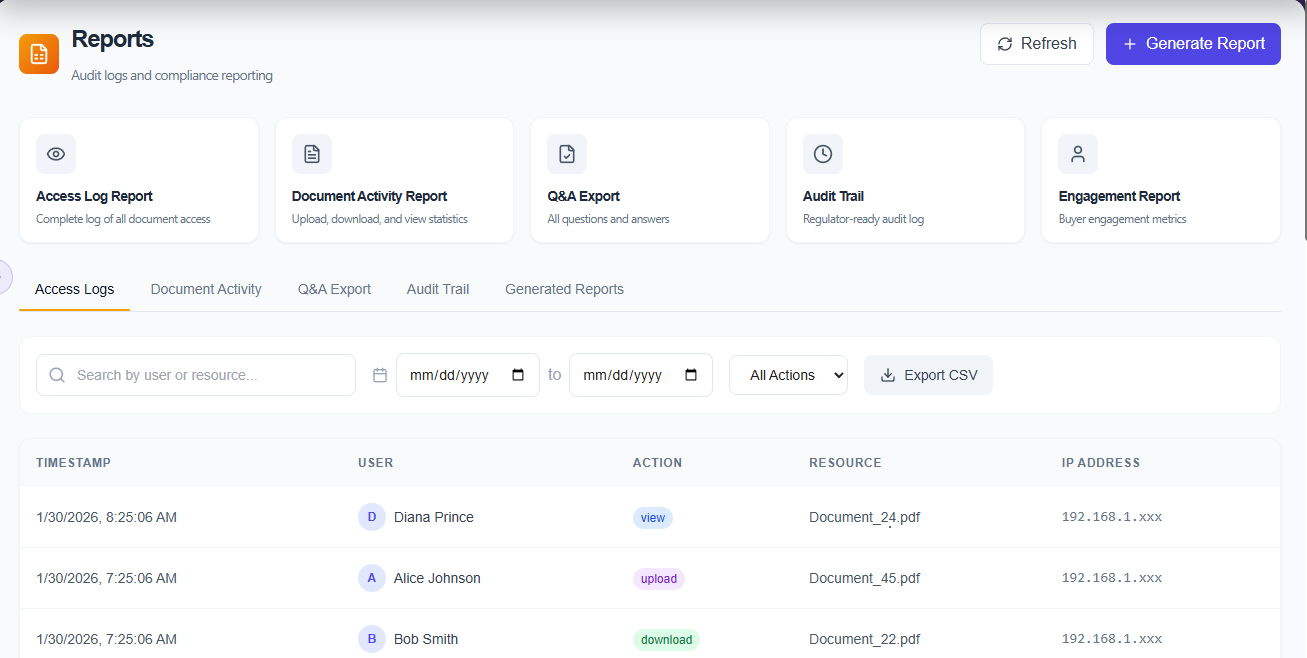 - Generate Access Logs, Document Activity, Q&A Export, Audit Trails, and Engagement Reports