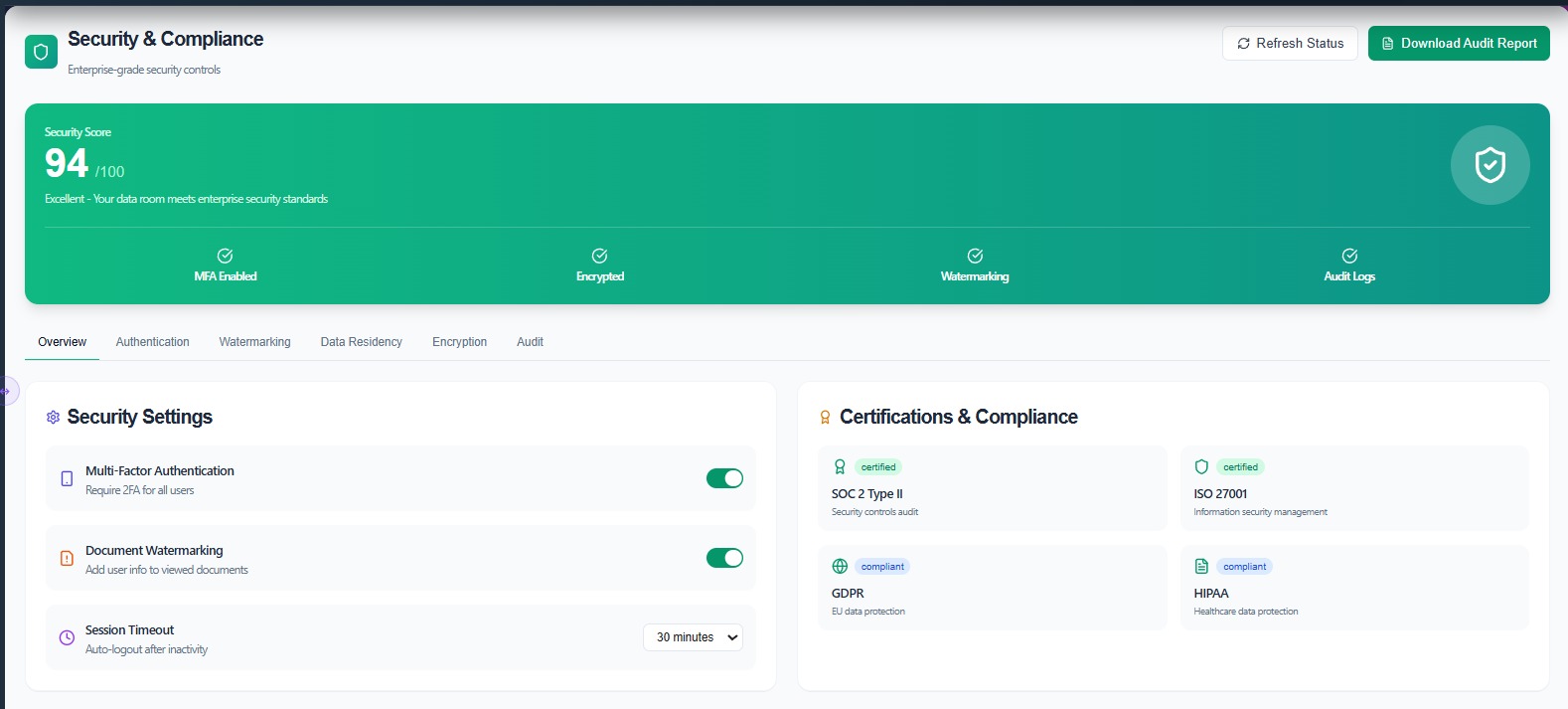 The Security & Compliance section provides enterprise-level security controls to protect sensitive deal data within the platform. It ensures that documents, user access, and transaction activities meet strict security and regulatory standards.