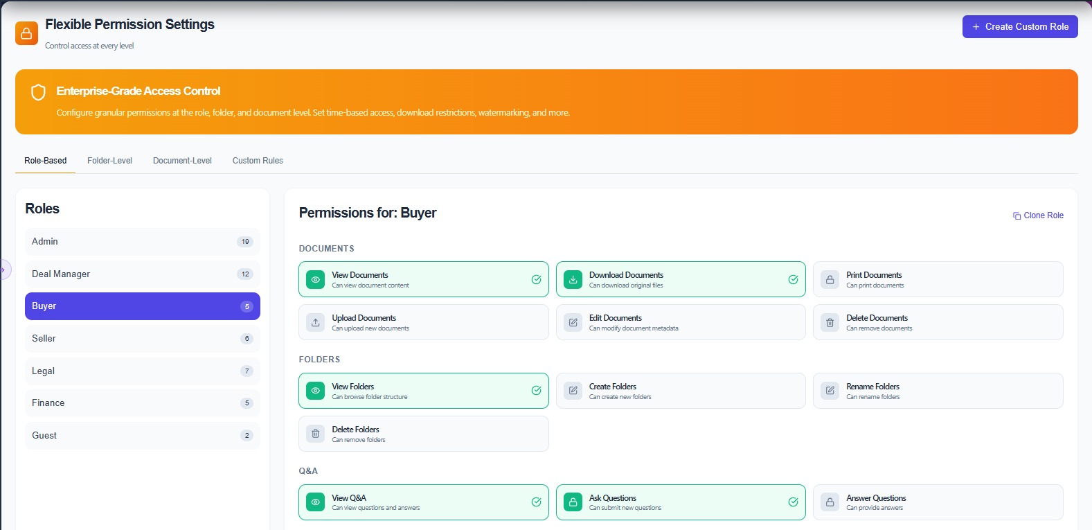Set role-based permissions for folders, documents, and Q&A. Control viewing, uploading, editing, downloading, and deleting for each role independently.